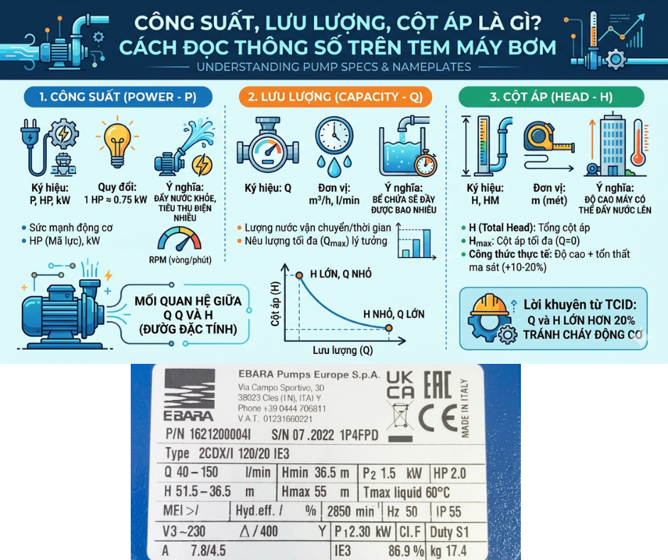 - Lưu ý: Lưu lượng ghi trên tem thường là tối đa (Qmax). Thực tế, khi đẩy càng cao, lưu lượng sẽ càng giảm.