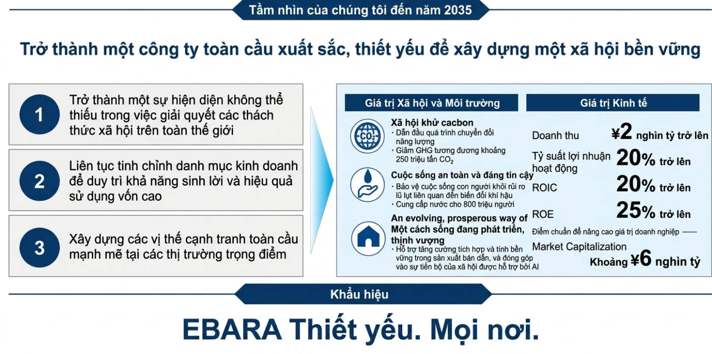 Tầm nhìn của chúng tôi đến năm 2035 là trở thành một công ty toàn cầu xuất sắc, đóng vai trò thiết yếu trong việc xây dựng một xã hội bền vững. Với khẩu hiệu “EBARA thiết yếu. Ở mọi nơi”, chúng tôi sẽ theo đuổi việc tạo ra giá trị xã hội và môi trường đồng thời tối đa hóa giá trị kinh tế.