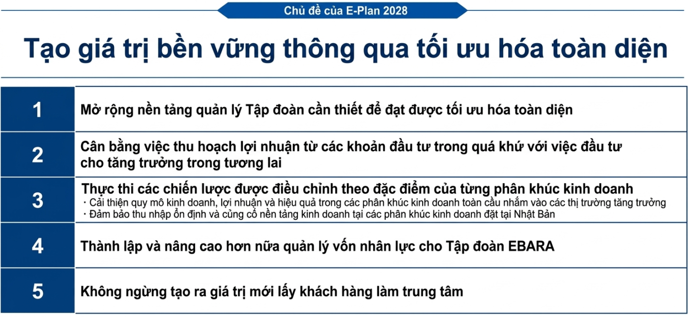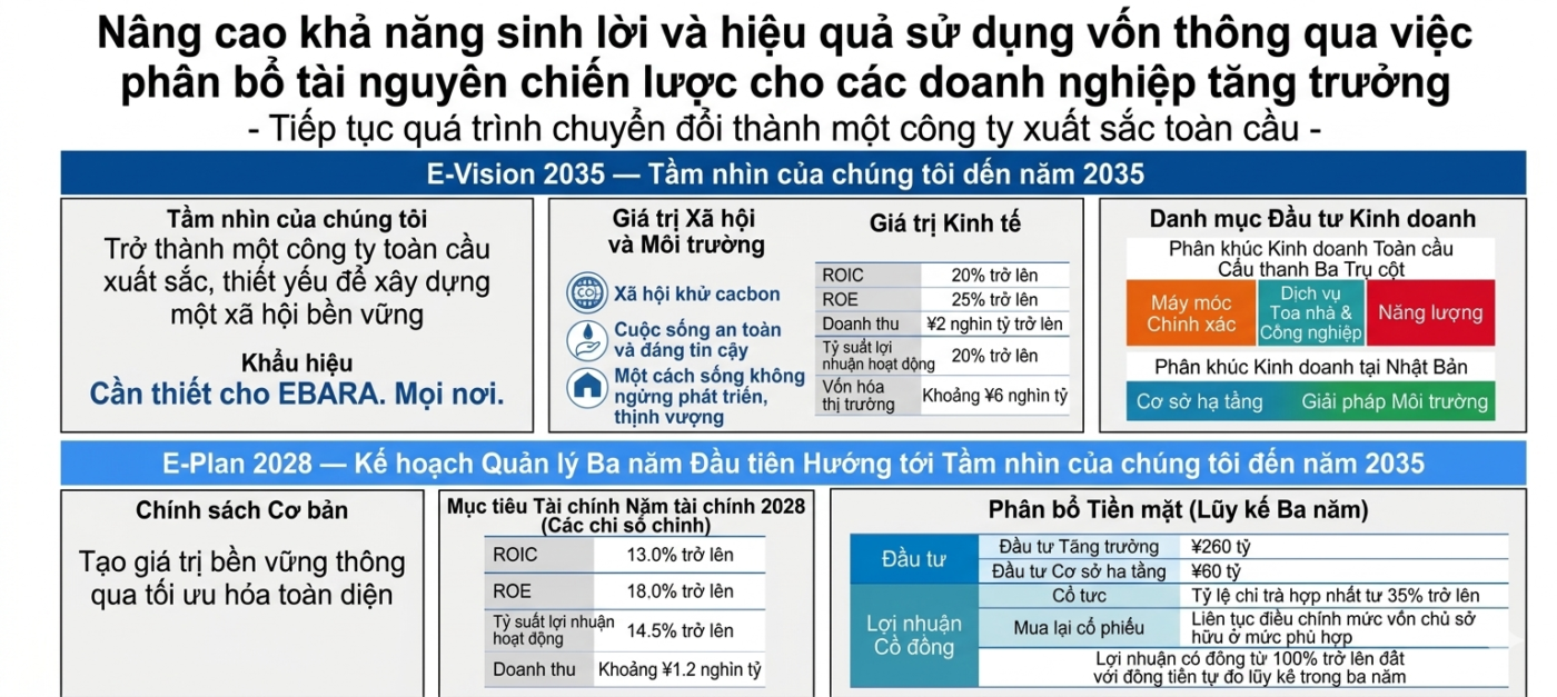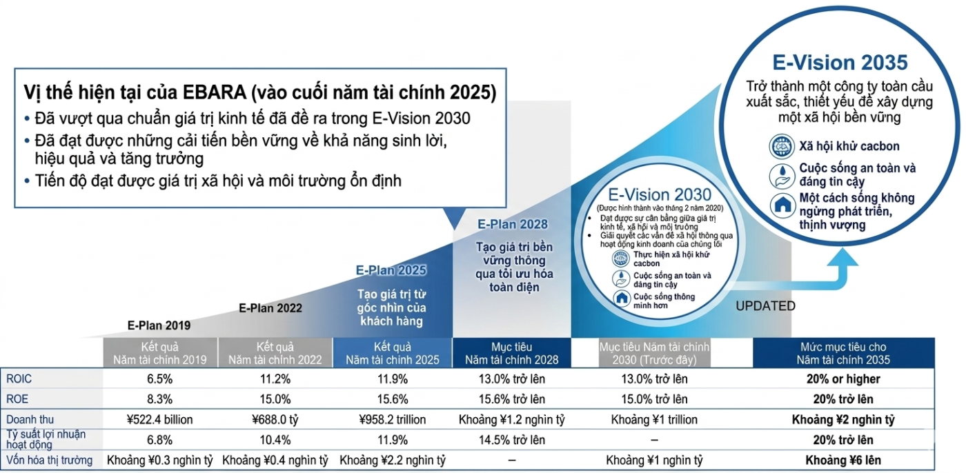 Tập đoàn EBARA đã đề ra tầm nhìn dài hạn của mình, E-Vision 2035, cùng với lộ trình ba năm đầu tiên để đạt được tầm nhìn đó, kế hoạch quản lý trung hạn, E-Plan 2028.