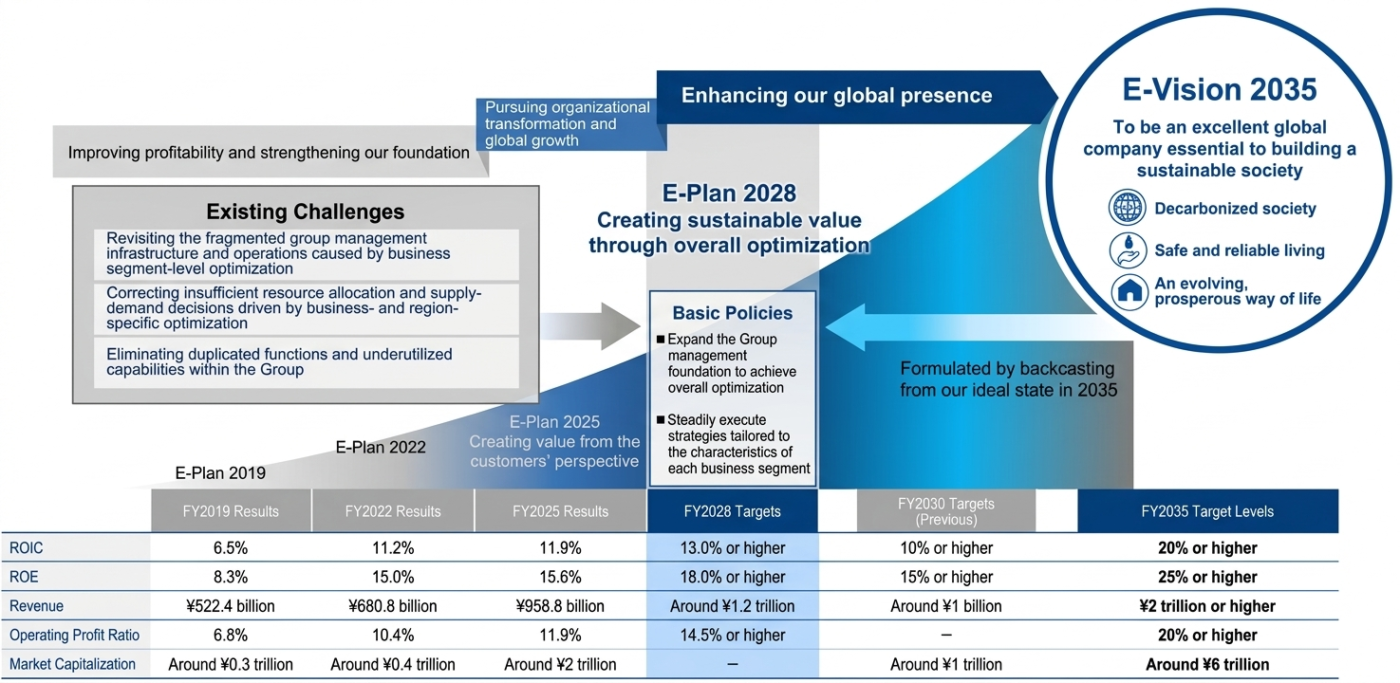 E-Plan 2028 là kế hoạch quản lý ba năm được xây dựng dựa trên phương pháp dự báo ngược từ tầm nhìn của chúng tôi đến năm 2035.